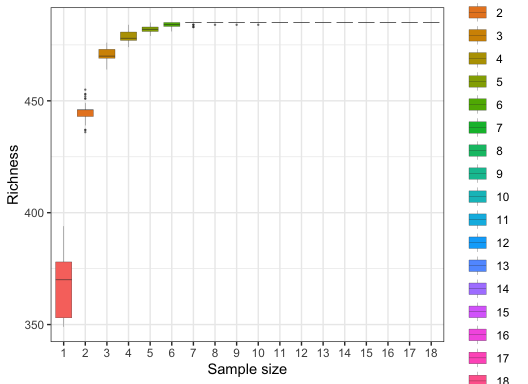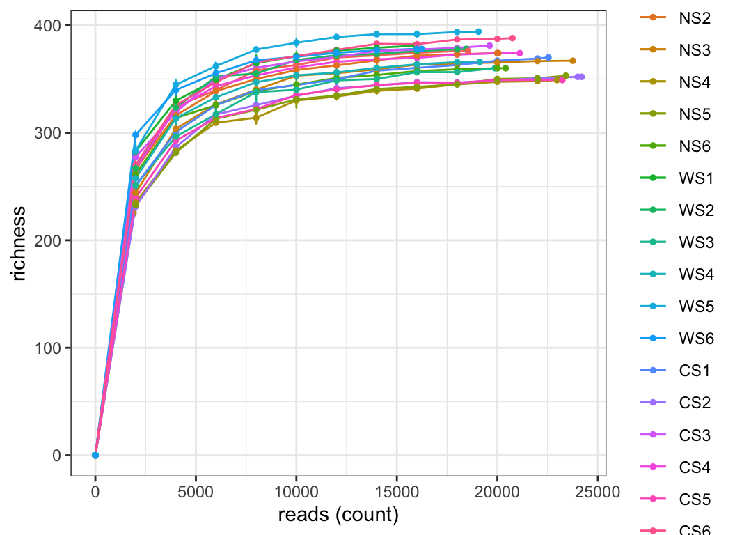 Rarefaction is a method used to assess the relationship between sample community data sampling effort and species richness within the sample. Commonly used in ecology, it evaluates whether the observed species diversity saturates given a certain number of samples or sequences, and whether additional sampling is needed to fully capture species richness within the sample.