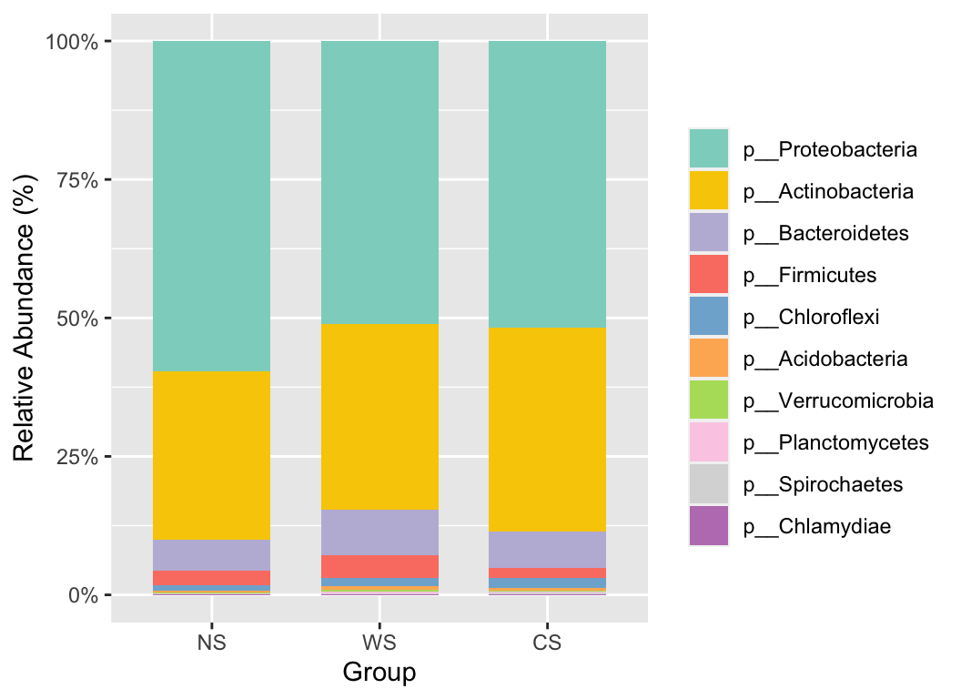 stackplot(phylum, metadata, group = "Group", topN = 10) +